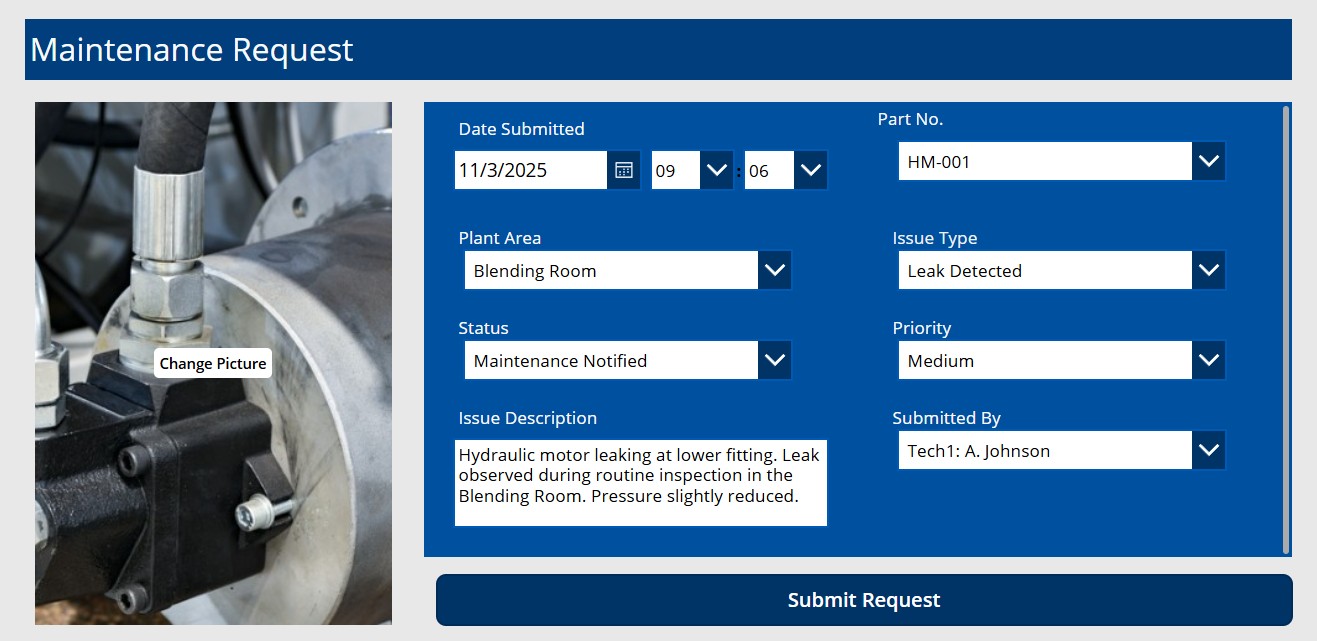 - Real-time form for line supervisors to log causes of downtime (e.g. Line1, Line2)
